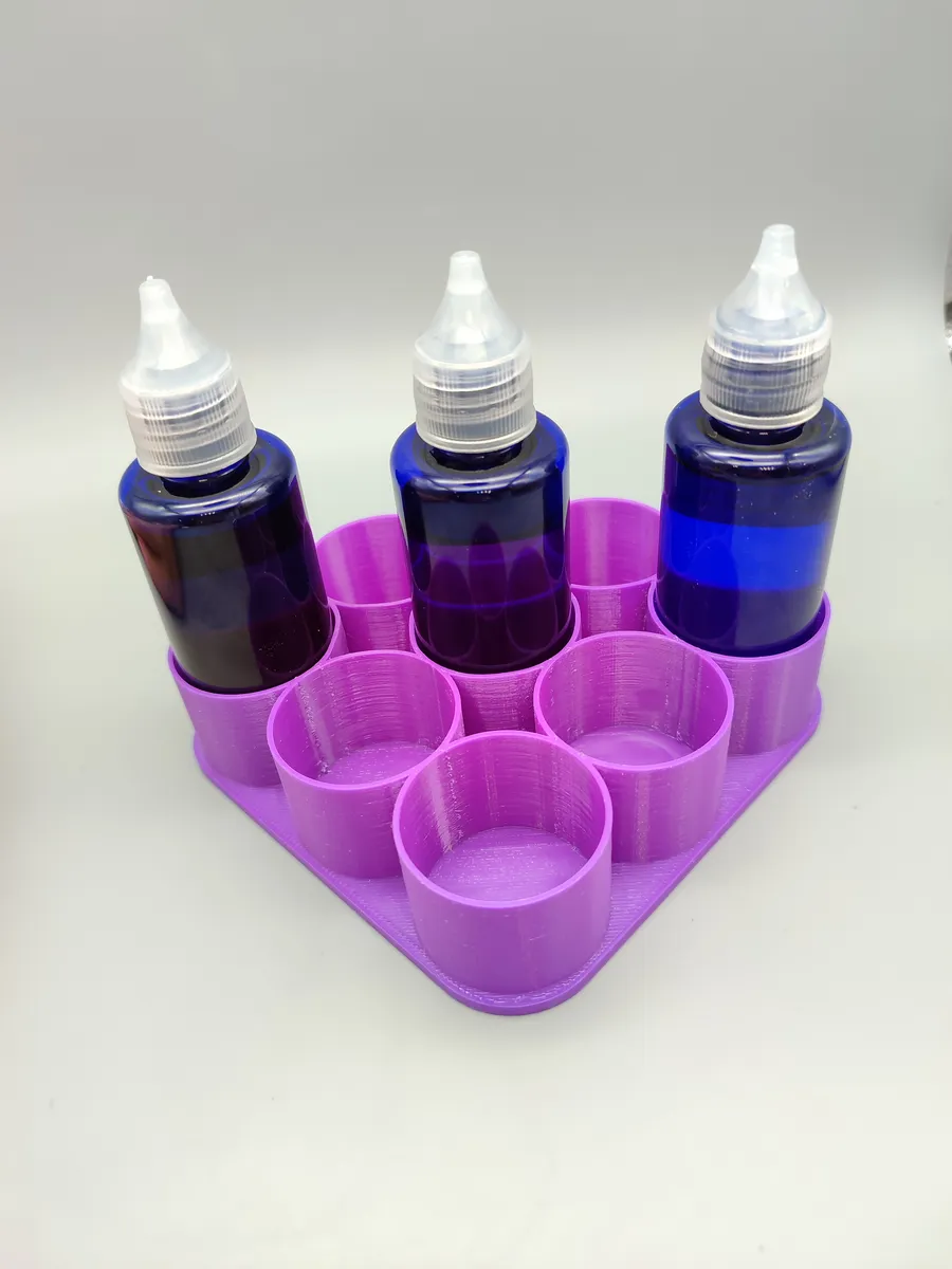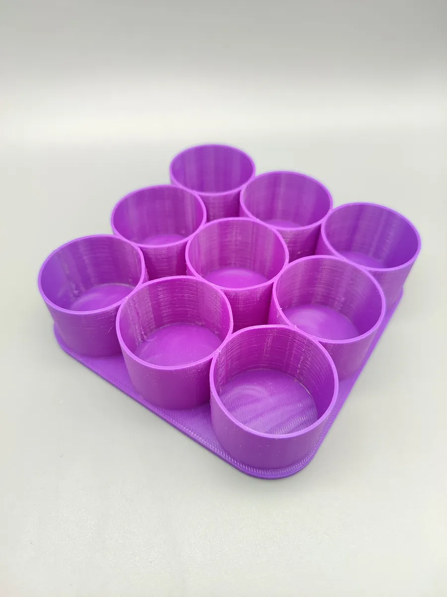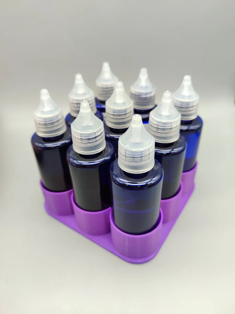 Подставка под флаконы с пигментами и отдушками от бренда TakKruto - это очень удобный аксессуар для мастеров. На подставке 9 ячеек диаметром 35 мм каждая. Размер подставки 11х11 см, высота 3 см. Поставка напечатана на 3д-принтере из PET-G пластика (безопасный пластик, который используется для бутылок под напитки).