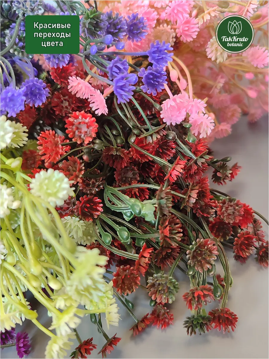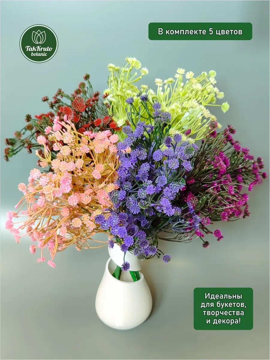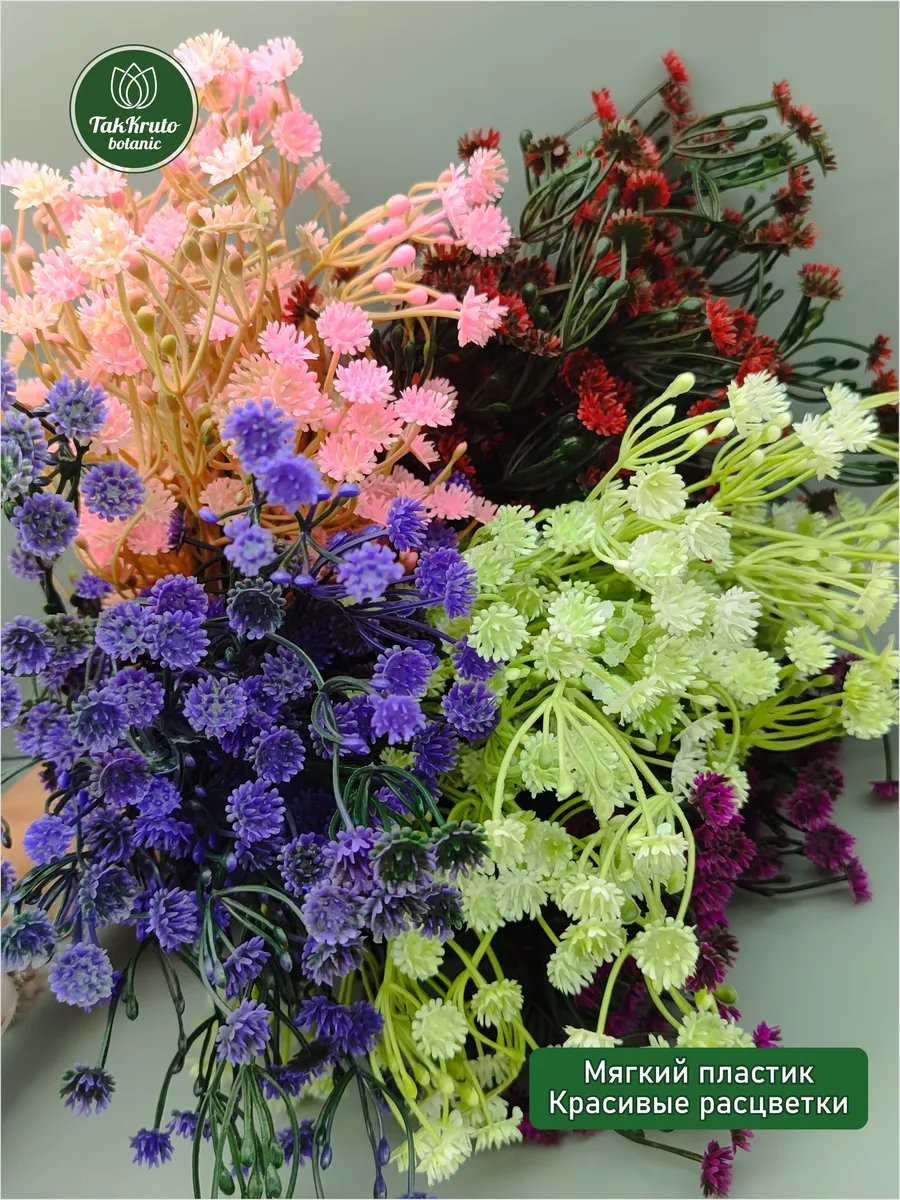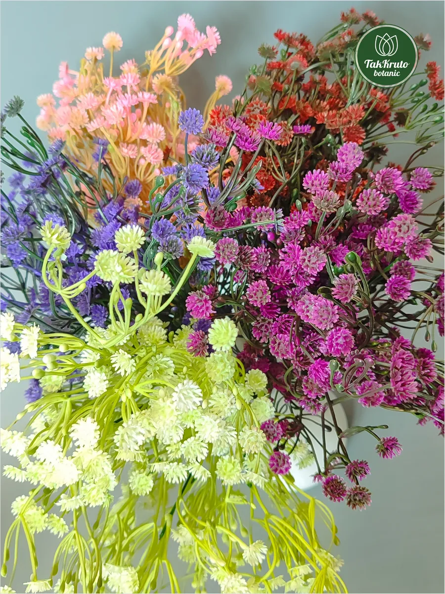 Искусственная зелень Гипсофила №1 от бренда TakKruto Botanic выполнена из качественного пластика и выглядит крайне реалистично. Декоративные искусственные ветки подходят для любого интерьера, выглядят, как настоящие живые, эти искусственные растения не требуют полива и особого ухода, сохраняют достойный внешний вид в течение долгого времени. Красивые интерьерные веточки можно собирать в большие букеты, эти эстетичные изделия подойдут для кухни, зала, их размещают на подоконнике, тумбочке или полке. Искусственная гипсофила идеально подходит для флористических композиций, творческих букетов из мыла, фоамирана, лент, бумаги, сухоцветов, сладостей, конфет. Наши искусственные растения используются для декора свадьбы, дня рождения, для создания цветочных арок, настенных, настольных и напольных композиций для декора. Эти пластиковые веточки можно собирать в большие букеты, ставить их в вазы и кашпо, украшать свой дом, гостиную, веранду, спальню. В комплекте 5 веточек длиной 35 см, 5 разных оттенков.