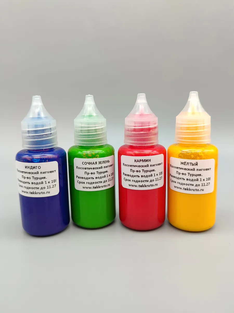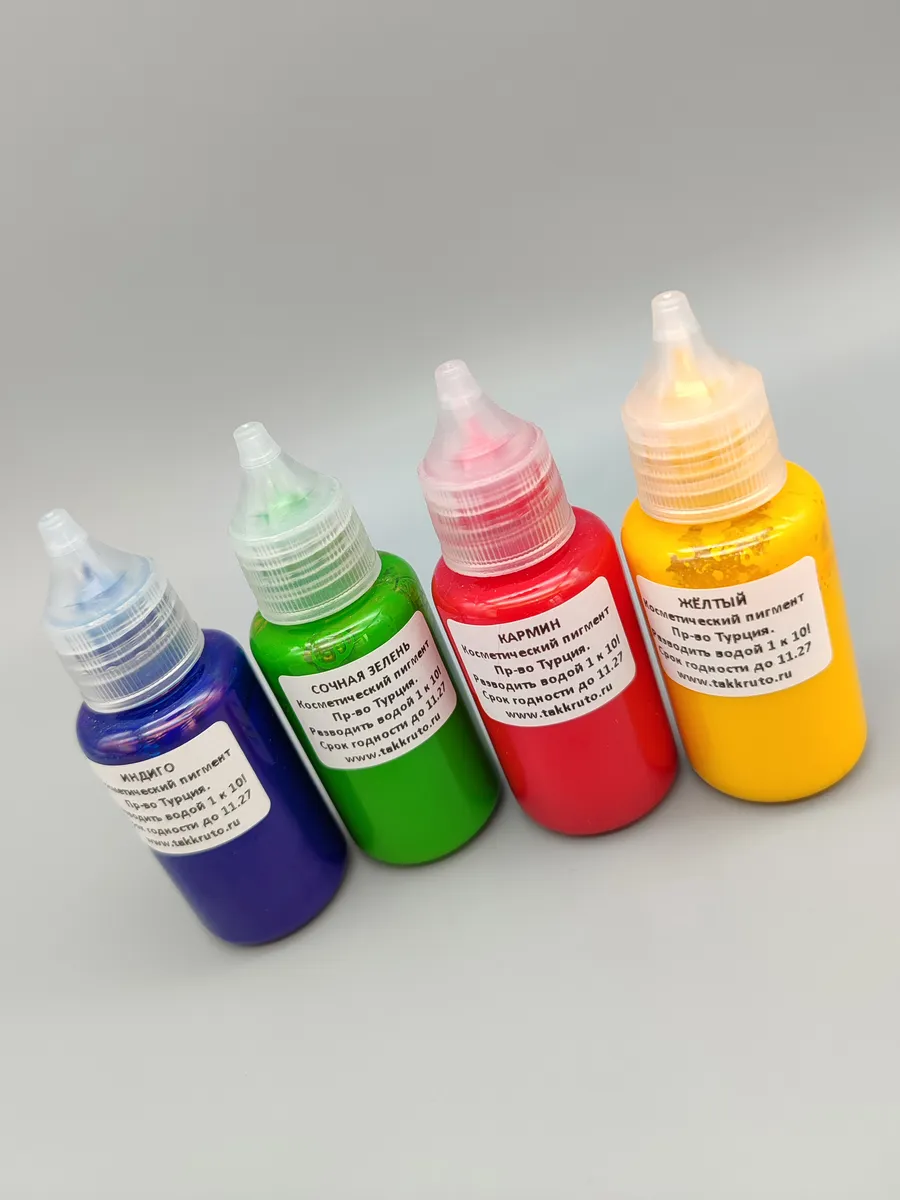 Высококачественные косметические пигменты для мыла от бренда TakKruto. Наши красители позволяют придать мылу насыщенные цвета, удобные в использовании за счёт жидкой консистенции. НЕ МИГРИРУЮТ В МЫЛЕ! В комплекте 4 флакона по 25 грамм каждый. Пигменты КОНЦЕНТРИРОВАННЫЕ! Перед применением их необходимо развести в пропорции 1 к 10 дистиллированной или бутилированной водой. Из 25 грамм концентрата получится 250 грамм готового к использованию пигмента для мыла, а из комплекта целый килограмм. Не разводите пигмент водой из-под крана! Не используйте неразведённый концентрат во избежание появления крупинок в мыле. Водная основа. Важно добавлять пигмент в не слишком горячую основу, чтобы избежать крупинок в мыле. Перед применением флакон необходимо интенсивно потрясти, потому что при длительном хранении пигменты могут расслаиваться, это нормально и не является браком. Производство Турция.