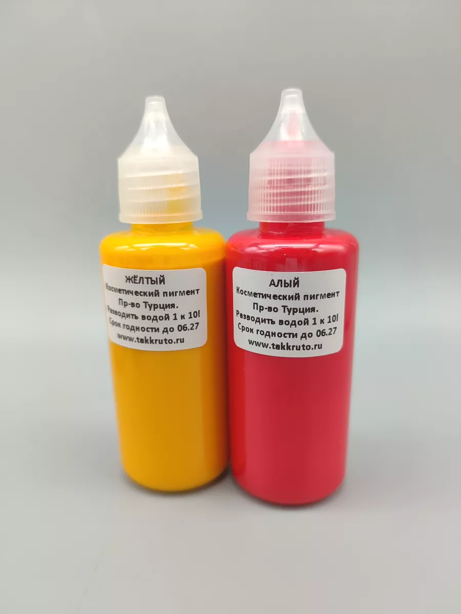Высококачественные косметические пигменты для мыла от бренда TakKruto. Позволяют придать мылу насыщенные цвета, удобные в использовании за счёт жидкой консистенции. НЕ МИГРИРУЮТ В МЫЛЕ! В комплекте 2 цвета по 50 грамм каждый. Пигменты КОНЦЕНТРИРОВАННЫЕ! Перед применением их необходимо развести в пропорции 1 к 10 дистиллированной или бутилированной водой. Из 50 грамм концентрата получится 500 грамм готового к использованию пигмента для мыла. Не разводите пигмент водой из-под крана! Не используйте неразведённый концентрат во избежание появления крупинок в мыле. Водная основа. Важно добавлять пигмент в не слишком горячую основу, чтобы избежать крупинок в мыле. Перед применением флакон необходимо интенсивно потрясти, потому что при длительном хранении пигменты могут расслаиваться, это нормально и не является браком. Производство Турция.