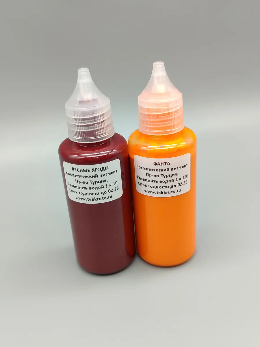 Высококачественные косметические пигменты для мыла от бренда TakKruto. Наши красители позволяют придать мылу насыщенные цвета, удобные в использовании за счёт жидкой консистенции. НЕ МИГРИРУЮТ В МЫЛЕ! В комплекте 2 флакона по 50 грамм каждый. Пигменты КОНЦЕНТРИРОВАННЫЕ! Перед применением их необходимо развести в пропорции 1 к 10 дистиллированной или бутилированной водой. Из 50 грамм концентрата получится 500 грамм готового к использованию пигмента для мыла. Не разводите пигмент водой из-под крана! Не используйте неразведённый концентрат во избежание появления крупинок в мыле. Водная основа. Важно добавлять пигмент в не слишком горячую основу, чтобы избежать крупинок в мыле. Перед применением флакон необходимо интенсивно потрясти, потому что при длительном хранении пигменты могут расслаиваться, это нормально и не является браком. Производство Турция.