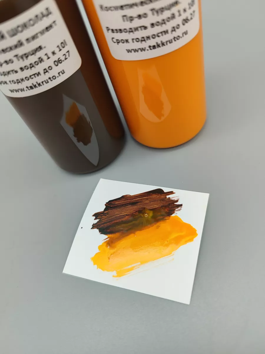 Высококачественные косметические пигменты для мыла от бренда TakKruto. Позволяют придать мылу насыщенные цвета, удобные в использовании за счёт жидкой консистенции. НЕ МИГРИРУЮТ В МЫЛЕ! В комплекте 2 цвета по 50 грамм каждый. Пигменты КОНЦЕНТРИРОВАННЫЕ! Перед применением их необходимо развести в пропорции 1 к 10 дистиллированной или бутилированной водой. Из 50 грамм концентрата получится 500 грамм готового к использованию пигмента для мыла. Не разводите пигмент водой из-под крана! Не используйте неразведённый концентрат во избежание появления крупинок в мыле. Водная основа. Важно добавлять пигмент в не слишком горячую основу, чтобы избежать крупинок в мыле. Перед применением флакон необходимо интенсивно потрясти, потому что при длительном хранении пигменты могут расслаиваться, это нормально и не является браком. Производство Турция.