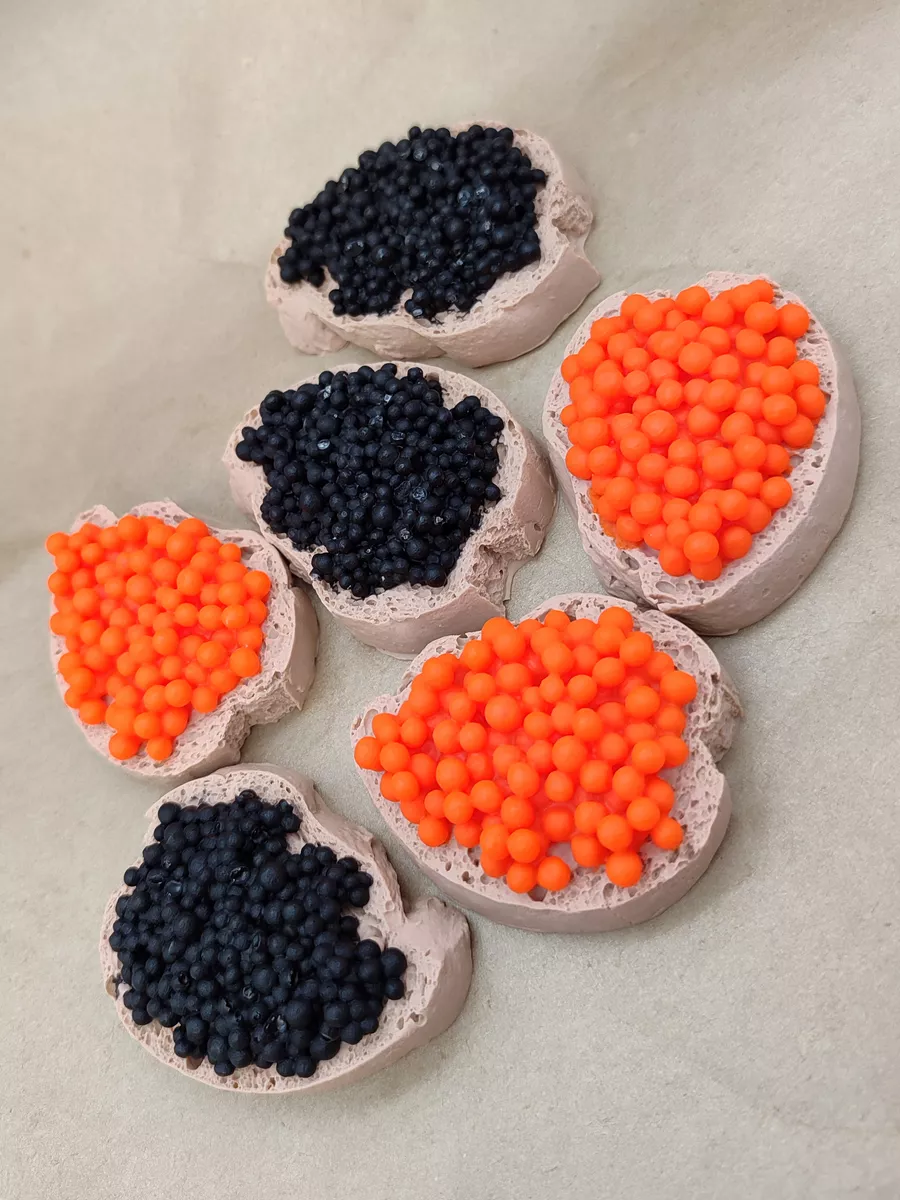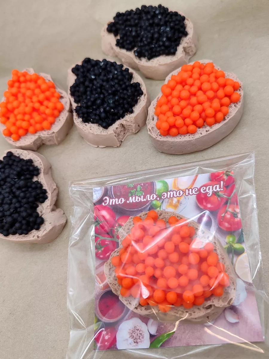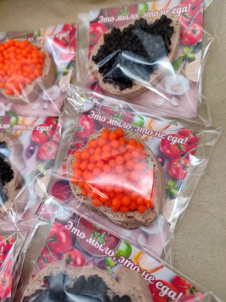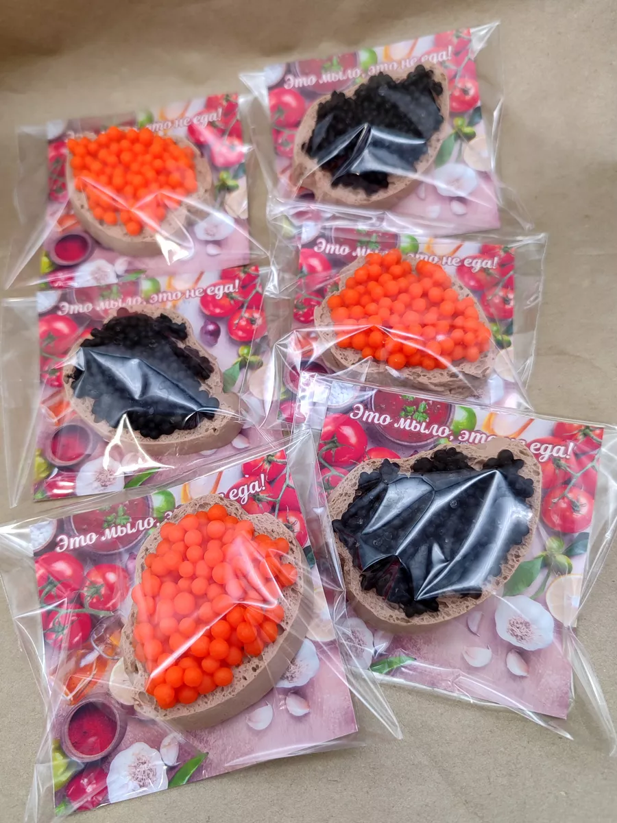 Мы предлагаем вам в качестве небольших подарков на 23 февраля или 8 марта наше мыло ручной работы Бутерроды с икрой. В наборе 6 кусочков мыла ручной работы весом 40 гр (+-5 гр), каждый бутерброд имеет вкусный аромат. 3 бутерброда с красной икрой, 3 бутерброда с чёрной, диаметр каждого ~6 см. Мыльные бутерброды с икрой - прекрасный подарок! Каждый мыльный бутер индивидуально упакован в прозрачный пакетик с картонной подложкой с надписью "Это мыло, это не еда!", таким образом вы получаете шесть готовых подарков.