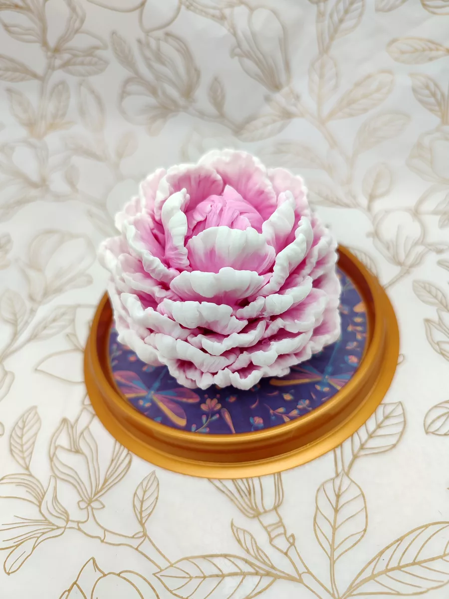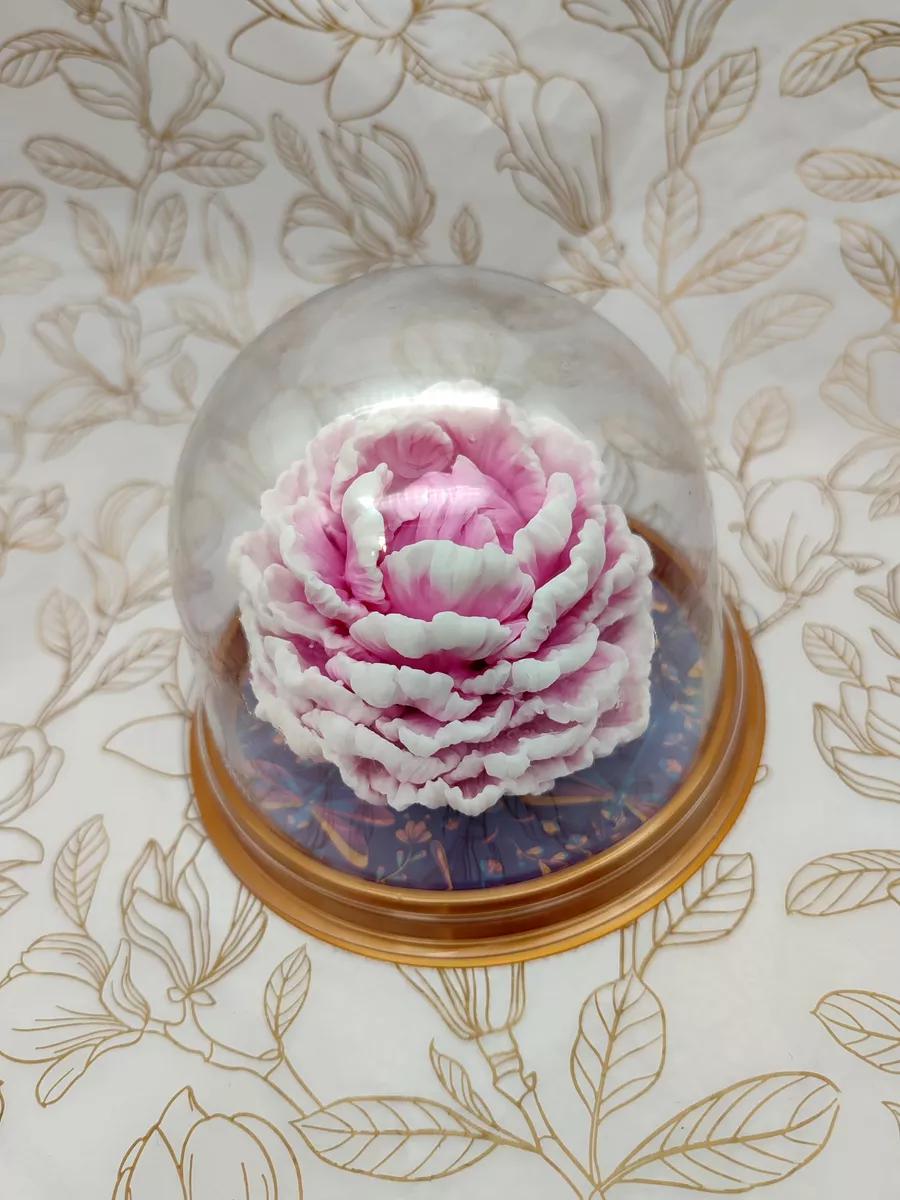 Мыло ручной работы Большой пион - прекрасный подарок на день Влюбленных, 8 марта или день Рождения! Пион из мыла упакован в красивый прозрачный купол с золотистым дном и картонной подложкой. Наше мыло имеет приятный и нежный цветочный аромат, вес мыльного пиона ~110 гр (+-10 гр), высота ~7 см. Купол с мылом аккуратно упакован в картонную коробку с мягким наполнителем. Также наполнитель лежит внутри купола, вам необходимо открыть купол и удалить защитный наполнитель.