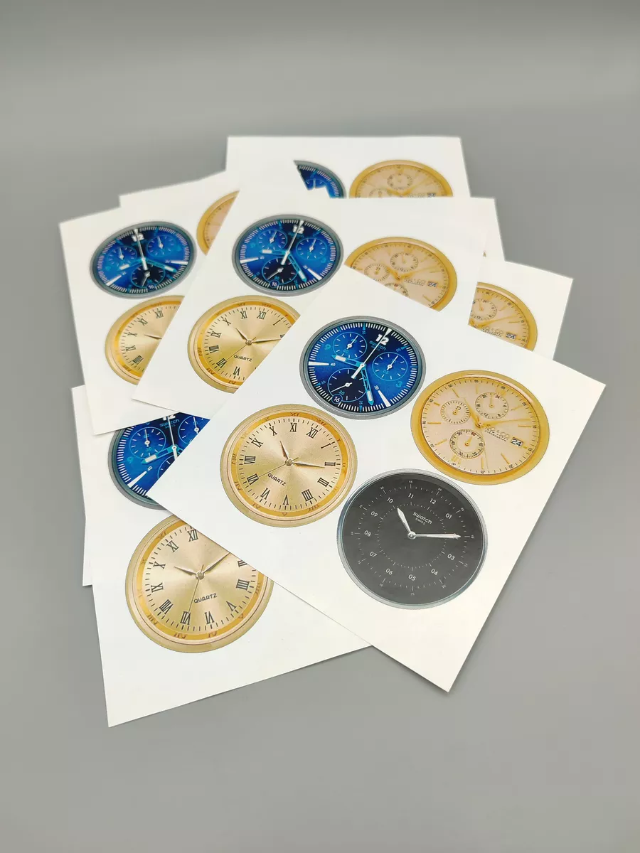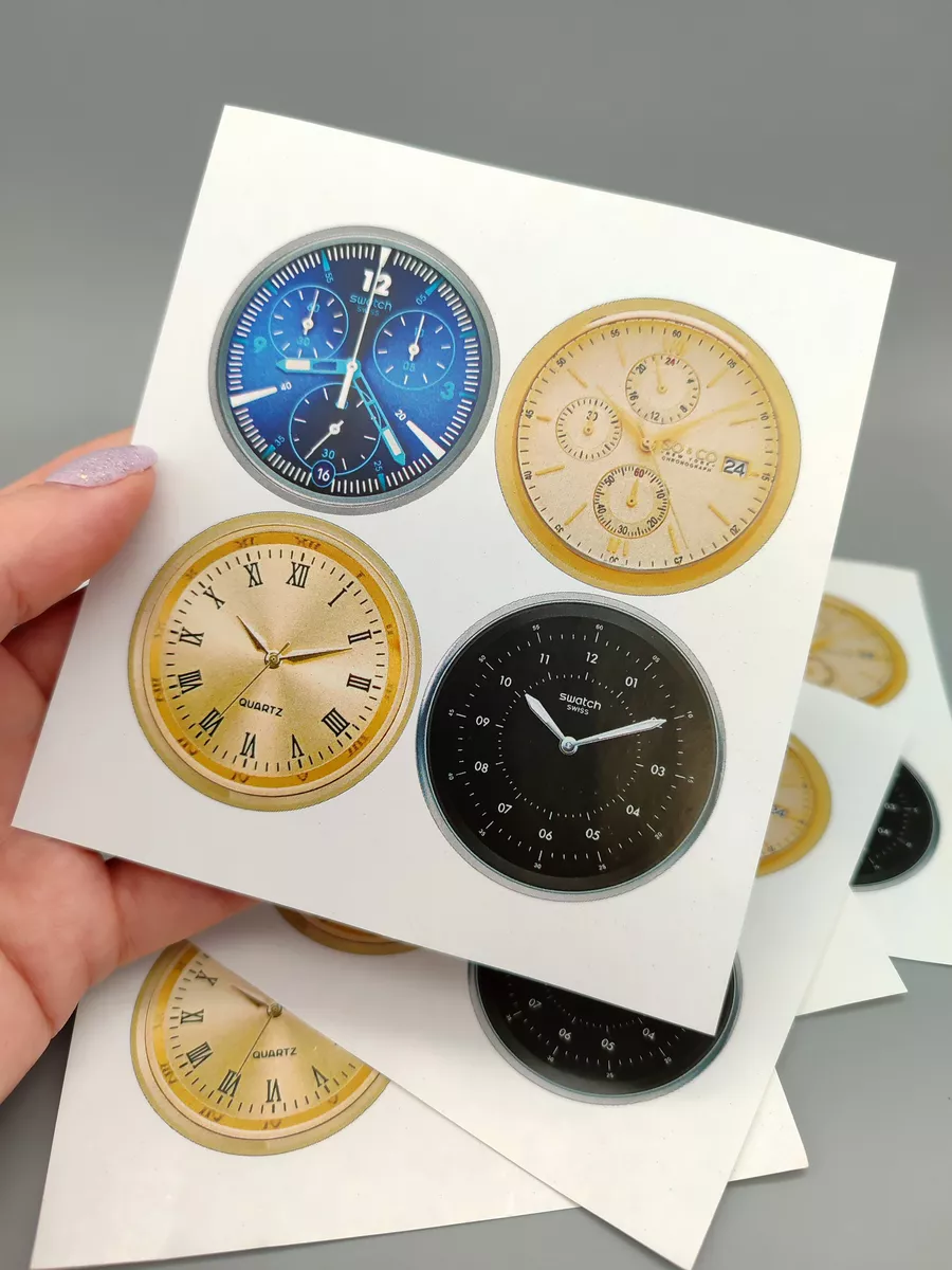 Декор для мыла ручной работы в виде циферблатов часов от бренда TakKruto. Подходит к пластиковым формам Часы с металлическим браслетом (диаметр циферблата 46 мм) и Часы с кожаным браслетом (диаметр циферблата 40 мм). В комплекте 10 листов размером 11*12 см, на каждом листе 4 шт. Общее количество наклеек - 40 шт. Наклейки не вырубные! Их необходимо вырезать самостоятельно. Для лучшей фиксации на мыле рекомендуем дополнительно смазать края с помощью клея-карандаша.