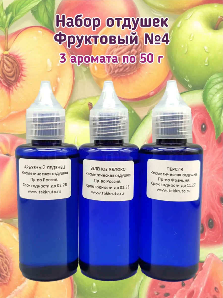 Набор из 3 косметических отдушек по 50 грамм. Ароматы: 1. Персик. Производство Франция. 2. Зелёное яблоко. Производство Россия. 3. Арбузный леденец. Производство Россия.