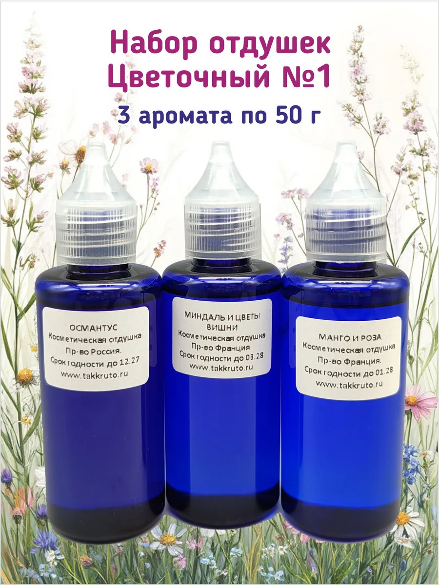 Набор из 3 косметических отдушек по 50 грамм. Ароматы: 1. Османтус - цветы азиатского вечнозелёного дерева, родственник сирени и оливы, в переводе с греческого «osmanthus» — «душистый цветок». Гармоничный микс спелых фруктов, цветочного нектара и бархатистой кожи. Это уютный, слегка пьянящий аромат с элегантным характером. Он подойдет тем, кто любит небанальные и выразительные ароматы. Производства Россия. 2. Миндаль и цветы вишни - один из хитовых цветочный ароматов, нежный и при этом стойкий. Производство Франция. 3. Манго и роза - СУПЕРХИТ! Роза здесь нежная и обволакивающая, а манго подчёркивает её красоту своей сочной сладостью. Производство Франция.