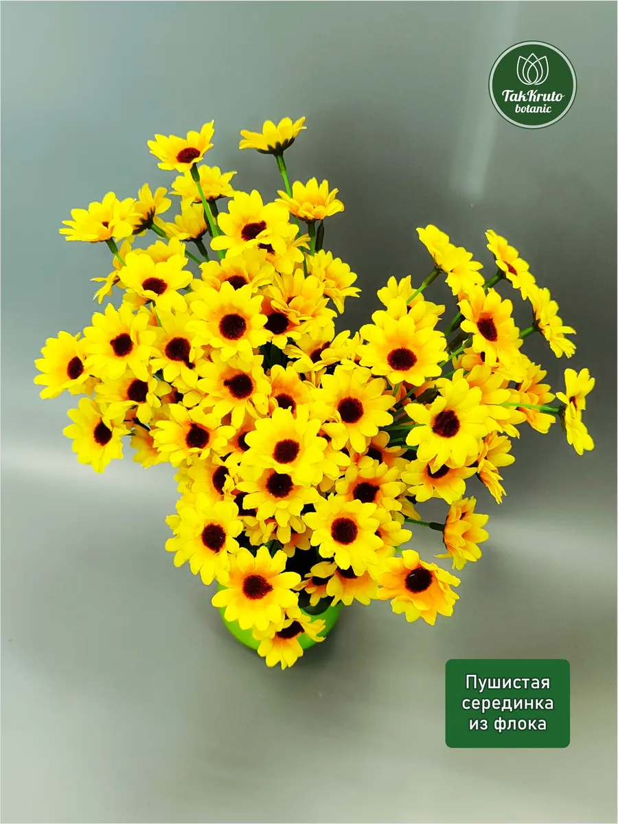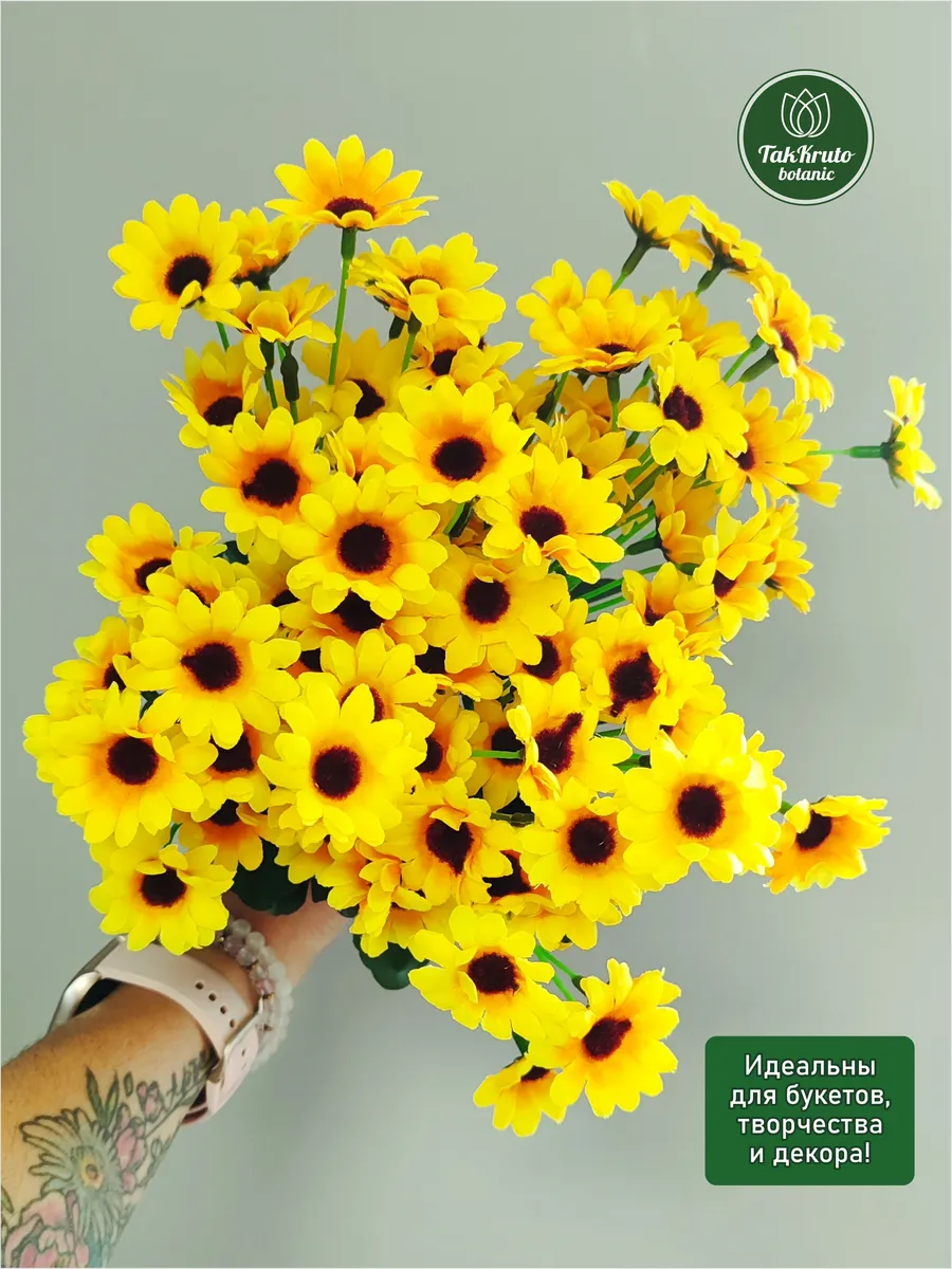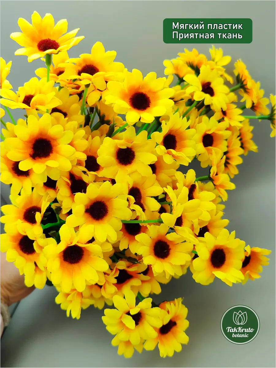 Искусственные цветы Мини-подсолнухи от бренда TakKruto Botanic выполнены из качественного пластика и ткани и выглядят крайне реалистично. Декоративные искусственные цветы подходят для любого интерьера, выглядят, как настоящие живые, эти декоративные растения не требуют полива и особого ухода, сохраняют достойный внешний вид в течение долгого времени. Красивые интерьерные цветочки можно собирать в большие букеты, эти эстетичные изделия подойдут для кухни, зала, их размещают на подоконнике, тумбочке или полке. Подсолнухи идеально подходят для флористических композиций, творческих букетов из мыла, фоамирана, лент, бумаги, сухоцветов, сладостей, конфет. Наши искусственные растения используются для декора свадьбы, дня рождения, для создания цветочных арок, настенных, настольных и напольных композиций для декора. Эти красивые цветочные ветки можно собирать в большие букеты, ставить их в вазы и кашпо, украшать свой дом, гостиную, веранду, спальню. В комплекте 4 веточки длиной 33 см, на каждой веточке 22-24 цветочка диаметром ~4 см.